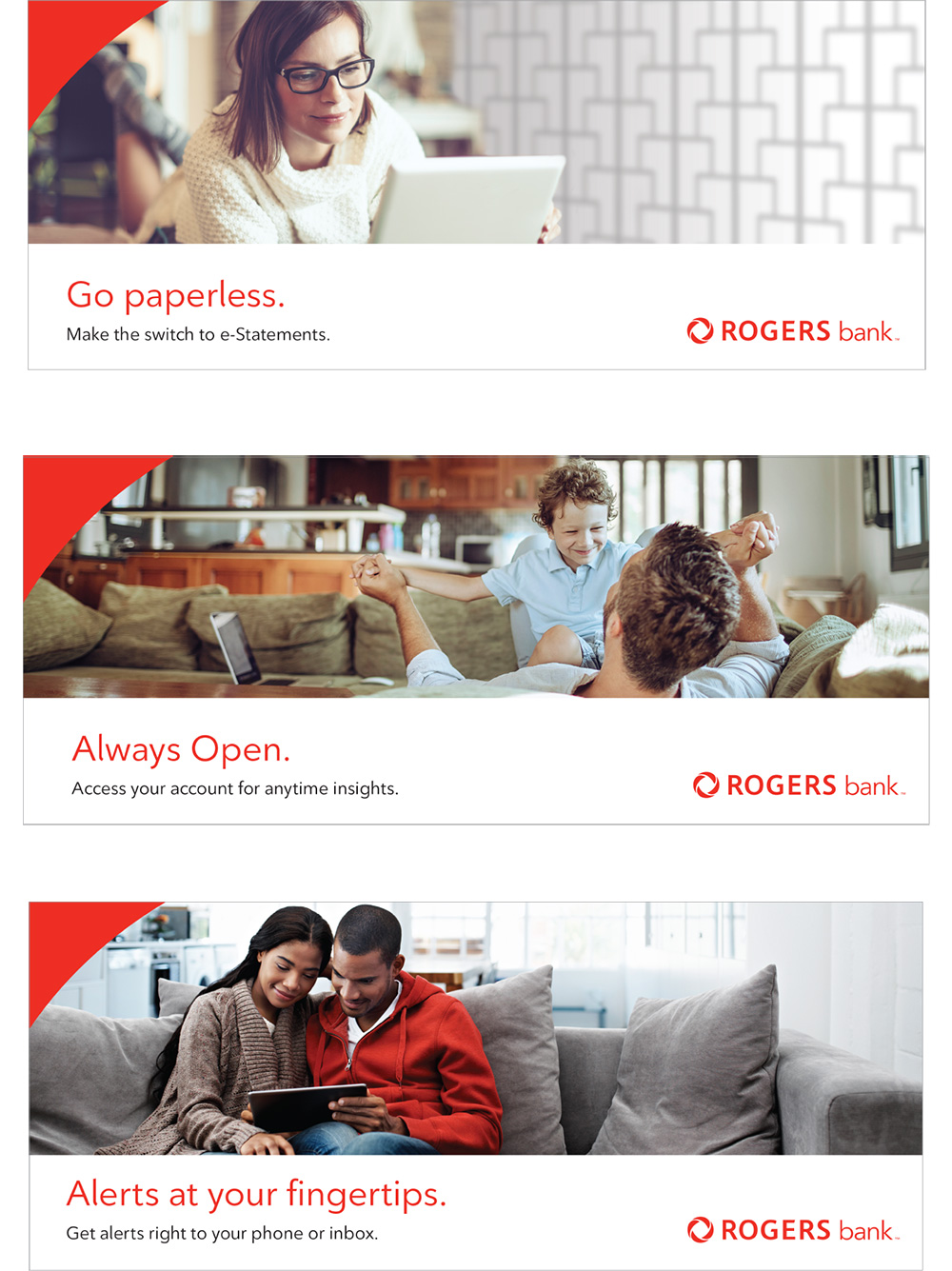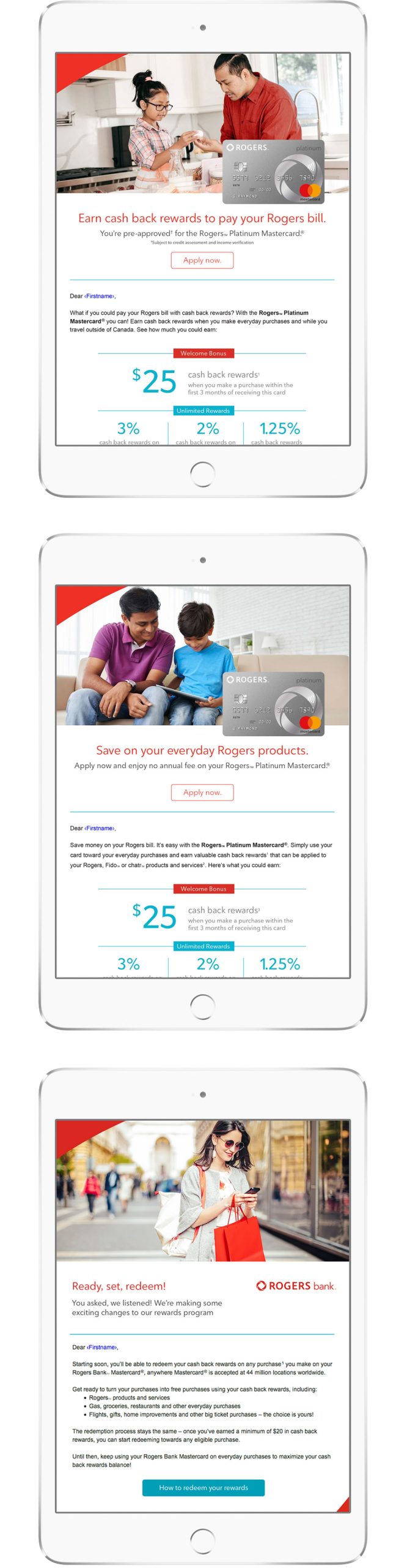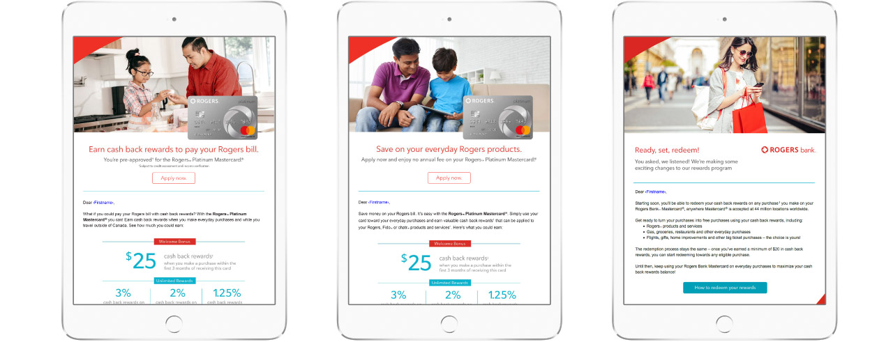 For the past three years, we have been executing acquisition and retention programs, stand-alone campaigns, and onboarding programs. These programs have included tactical initiatives like email, landing pages, web pages, online display ads/banners, and printed assets for the Rogers Platinum Mastercard, Fido Mastercard and the introduction of the new Rogers World Elite Mastercard . Along with most digital campaigns, our tasks also include monitoring metrics and coordinating with their ESP partner.